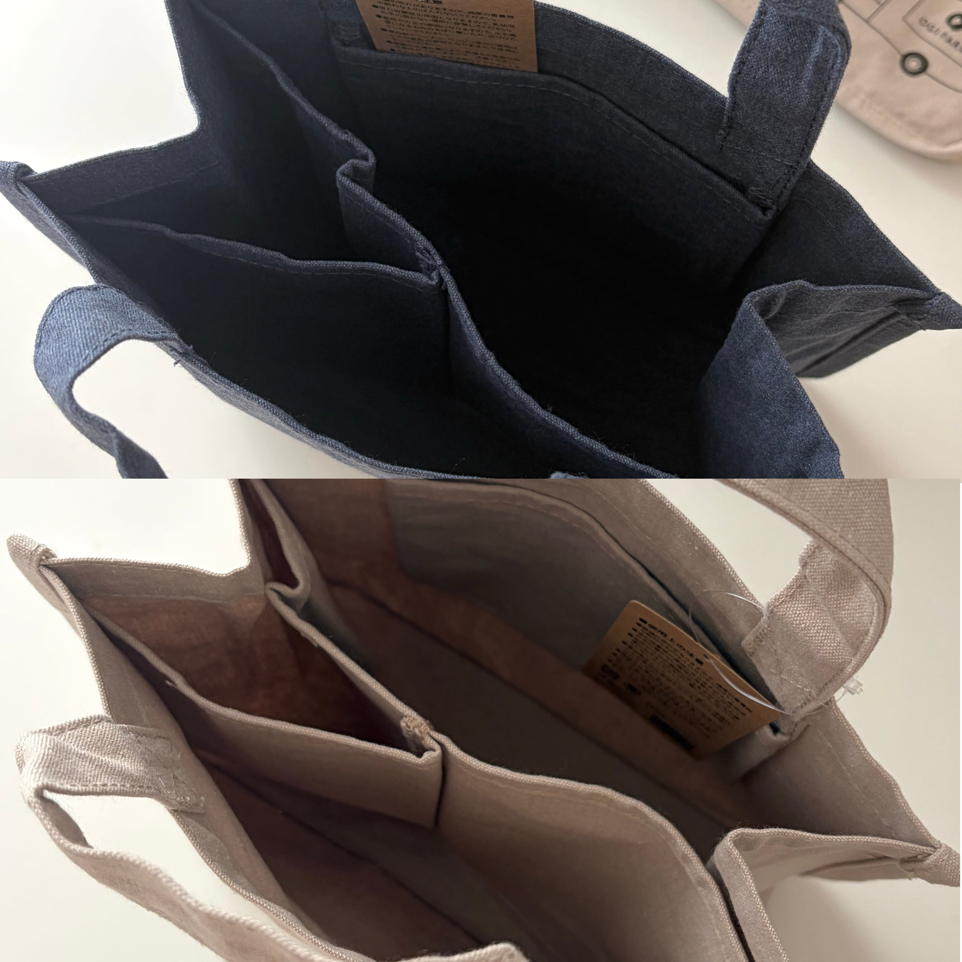 荷物の大きさによって仕切りを動かせる再生素材100%のキャンバストート。